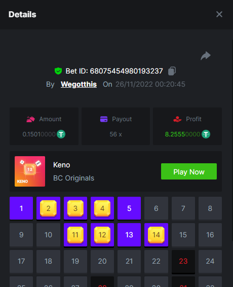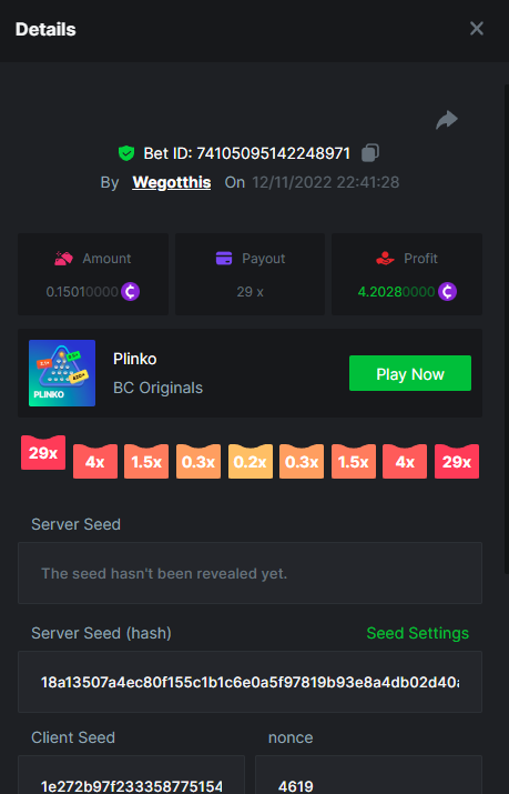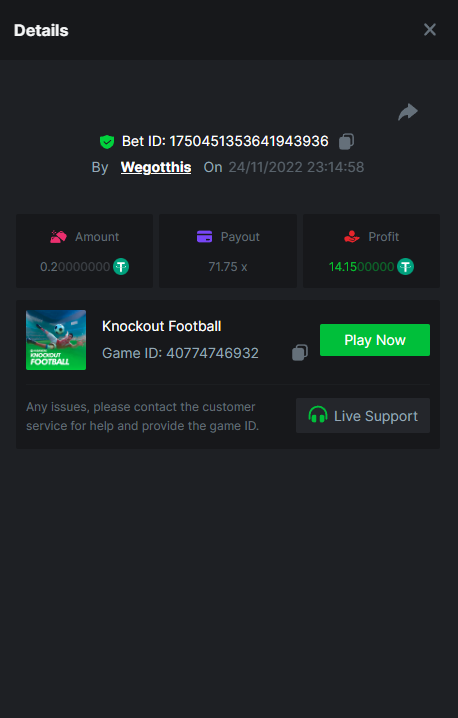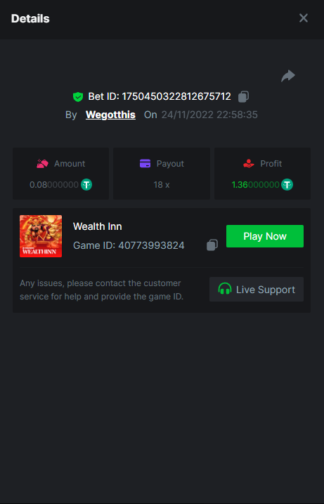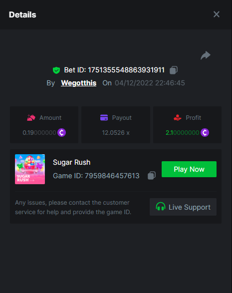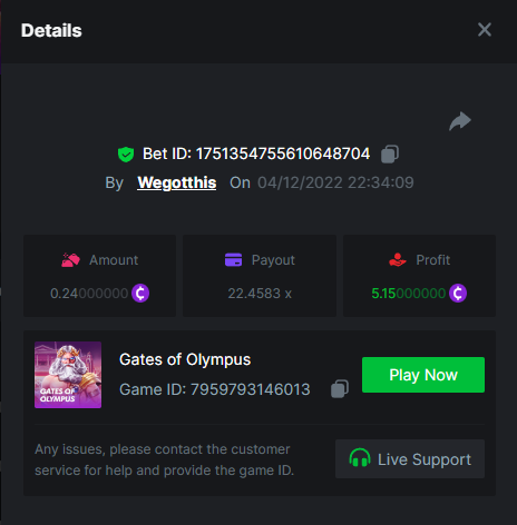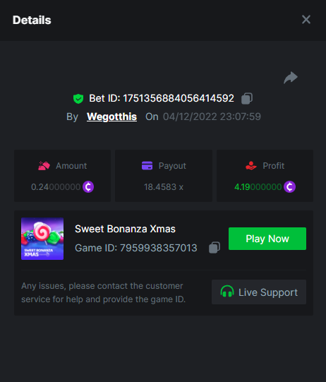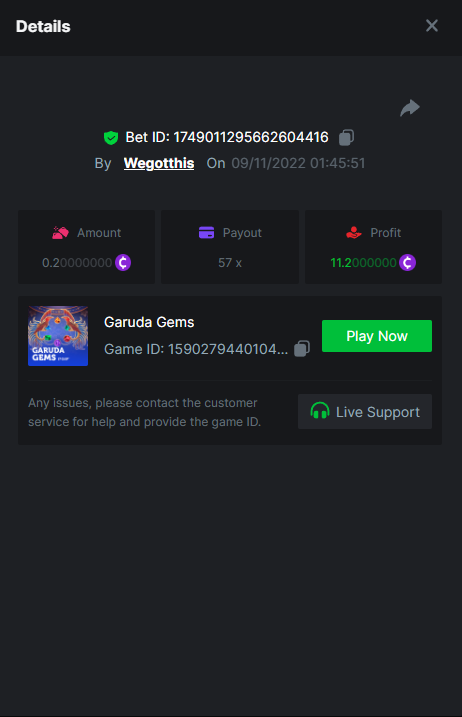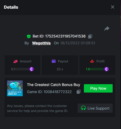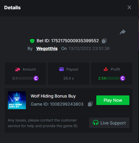 3. https://bc.game/#/sd/10YLHMO9FMMHW3 https://bc.game/#/sd/10YLI16E0IO0LV https://bc.game/#/sd/10YLIEX5ZDW9OZ I don't know why the bet ID shows 1 cent less per bet, while it's 10 cents on the provider's page. This would have made me eligible for bounty with exactly 50x. Look at screenshot below for example. https://bc.game/#/sd/10YLIV09L2KW7N https://bc.game/#/sd/10YLJADSJL3L77 https://bc.game/#/sd/10YLJI9Y61ZCIB https://bc.game/#/sd/10YLJVIP8441ZN https://bc.game/#/sd/10YLK4I9DYJAJ7