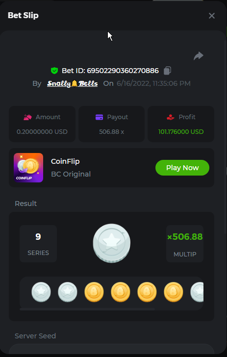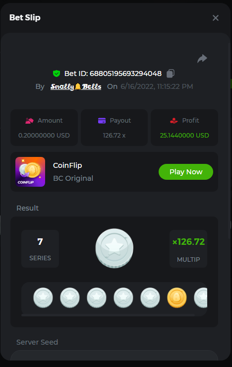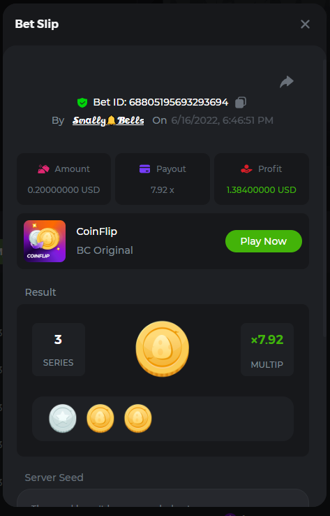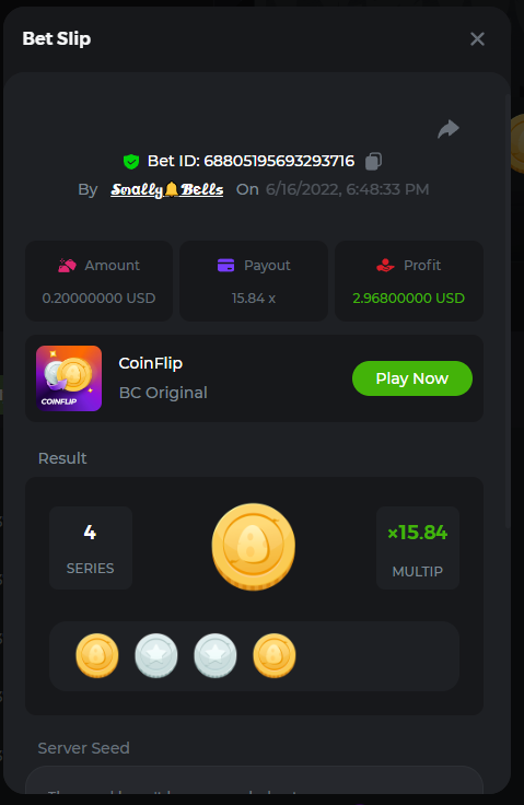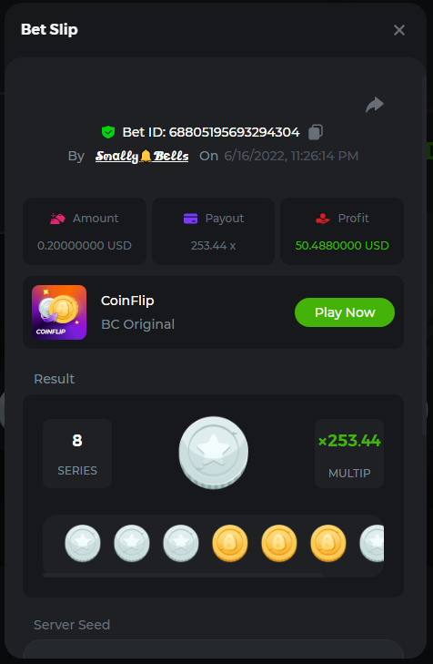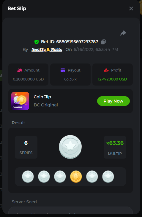 1. Sweet Bonanza: 196.44x https://hash.game/sd/?sd=10O1L1AME2AO0J Gates of Olympus: 360x https://hash.game/sd/?sd=10NXINXXM5HPUB Big Bass Bonanza: 272.5x https://hash.game/sd/?sd=10NXGKI8MBUBYR Wild West Gold Megaways: 209.12x https://hash.game/sd/?sd=10NSHRFA3IZXG3 Bigger Bass Bonanza: 636.5x https://hash.game/sd/?sd=10O4IBZ1B94M4Z Sweet Bonanza Xmas: 423x https://hash.game/sd/?sd=10NSIW1H25RBBN Starlight Princess: 285.36x https://hash.game/sd/?sd=10NSBCSCJUJAJ7 Dog House Megaways: 415x https://hash.game/sd/?sd=10NTX8PH8UUHHV It doesn't matter for anything but just FYI in case it's reused - the prize pool table pic says "4rd place" lol Bounty: 50x (idk why its .0001x - LTC fluctuations maybe...was a $5.00 win on a $0.10 bet though) https://hash.game/sd/?sd=10NXOMAF8XVF2R