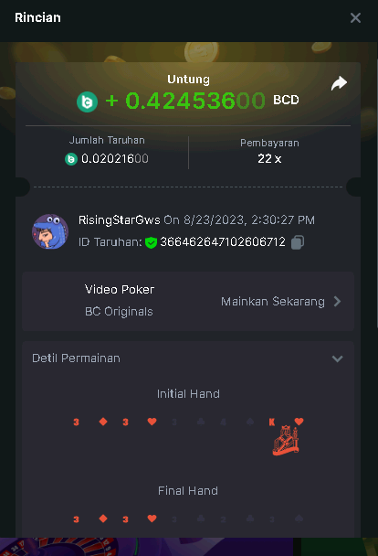 Moderator Giandreas Posted August 23, 2023 Moderator Share Posted August 23, 2023 Read Carefully Before Start To Hunt Forum Daily Challenges #336 Video PokerHunt : Video Poker Win the highest pay out Min Payout min 3x Min Level 4️Duration Starting : Now End time : 23.59 UTC Time How to Join? Make screenshot + paste your bet link + UID or Profile link Any coin, with min bet 0.01 USD is allowed (jb/bb/bcl not allowed)Reward Prizes 1st Place.....$7 BCD 2nd Place.....$5 BCD 3rd Place.....$4 BCD 4th Place.....$3 BCD 5th Place.....$2 BCD 🏵 Winners will be announcing next day after Roll Point! 1 Link to comment Share on other sites More sharing options...