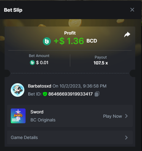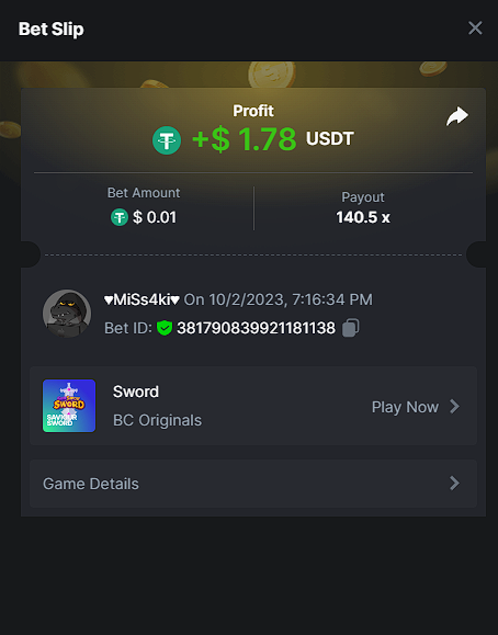 Moderator Giandreas Posted October 2, 2023 Moderator Share Posted October 2, 2023 Read Carefully Before Start To Hunt Forum Daily Challenges #375Hunt : Sword Win the highest pay out Min Payout : x20 Min Level 4️Duration Starting : Now End time : 23.59 UTC Time How to Join? Make screenshot + paste your bet link + UID or Profile link Any coin, with min bet 0.01 USD is allowed (jb/bb/bcl not allowed)Reward Prizes 1st Place.....$7 BCD 2nd Place.....$5 BCD 3rd Place.....$4 BCD 4th Place.....$3 BCD 5th Place.....$2 BCD 🏵 Winners will be announcing next day after Roll Point! 2 Link to comment Share on other sites More sharing options...