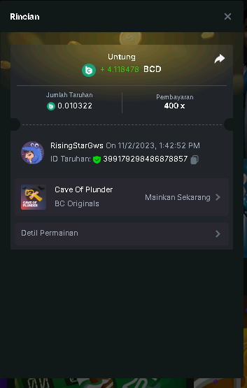 Moderator Giandreas Posted November 2, 2023 Moderator Share Posted November 2, 2023 Read Carefully Before Start To Hunt Forum Daily Challenges #406Hunt : cave of plunder Win the highest pay out Min Payout : 17x Min Level 4️Duration Starting : Now End time : 23.59 UTC Time How to Join? Make screenshot + paste your bet link + UID or Profile link Any coin, with min bet 0.01 USD is allowed (jb/bb/bcl not allowed)Reward Prizes 1st Place.....$7 BCD 2nd Place.....$5 BCD 3rd Place.....$4 BCD 4th Place.....$3 BCD 5th Place.....$2 BCD 🏵 Winners will be announcing next day after Roll Point! 2 Link to comment Share on other sites More sharing options...