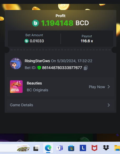 4th place . . . .RisingStarGws   116.6 x 1.19 . . . .3$ BCD