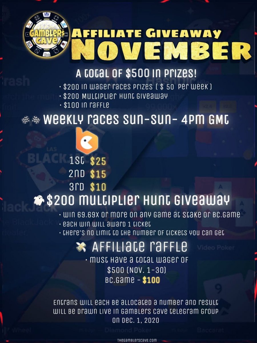 I’m running a giveaway for November which has a total of $500 in prizes for my BCGame affiliates. The comprises of $50 per week in a weekly wager race, $100 in monthly raffle prizes and $200 in a multiplier hunt giveaway.